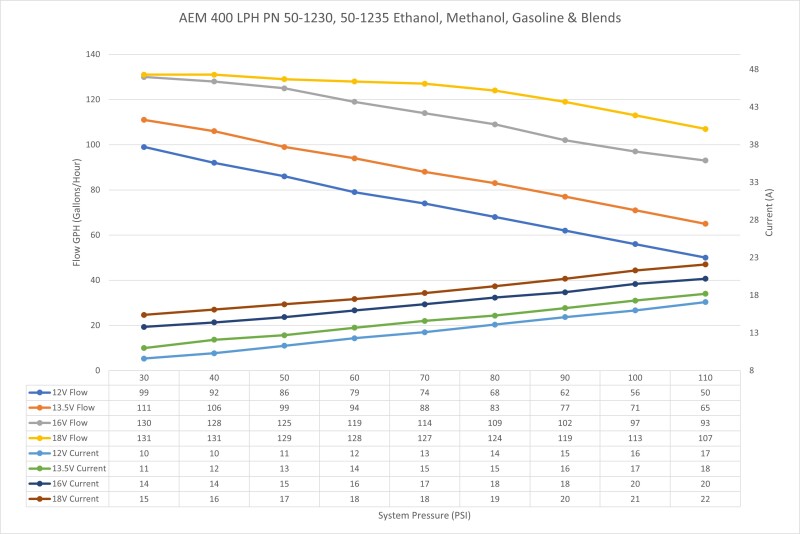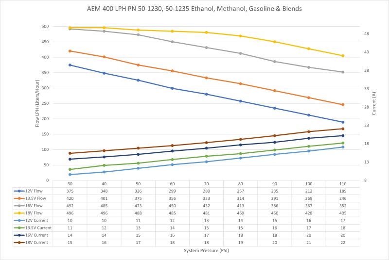 AEM’s 400LPH high flow fuel pumps were designed with high performance naturally aspirated and forced induction EFI vehicles in mind! They deliver the same high flow and reliable performance that AEM has become known for at very competitive price. Each pump is individually flow tested and guaranteed to flow 400+ LPH (106 GPH) at 40 PSI (13.5V), which on gasoline will support 1000+ horsepower!* The pumps also maintain their high flowrate even as system pressure increases flowing 330+ LPH at 70 PSI (13.5V) which will support approx. 870 HP* on gasoline! Please see the flow curves and current draw vs. fuel pressure graphs on the specs tab for more information. With their compact 39mm body (same size as Walbro 255), low amperage draw, 11mm inlets and 9mm barbed outlet’s these fuel pumps were designed to replace the OEM fuel pump in many applications. The 50-1230 features a double barbed outlet that is ideal for 3/8-inch ID hose where the 50-1235 features a smooth barbed outlet that is compatible with 5/16-inch ID hose. Each pump includes a wiring harness, pre filter, internal fuel hose and clamps, end cap and rubber buffer sleeve.