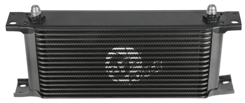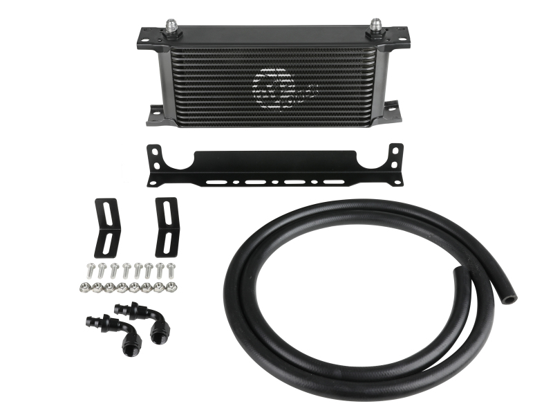 This BladeRunner Oil Cooler uses a durable brazed all-aluminum stacked-plate construction that allows for greater efficiency and lower pressure drop than a standard tube-fin design. The included hoses are heavy-duty, high-temperature, and high-pressure rated. This kit is suitable for use with engine oil, transmission oil, power steering fluid, and more. This BladeRunner Oil Cooler makes installation simple with aluminum universal mounting brackets, stainless steel hardware, and leak-proof AN connections. BladeRunner Oil Coolers feature a durable black powder coated finish with a laser-etched aFe POWER logo on the front and include black-anodized billet aluminum AN fittings for a sleek appearance.