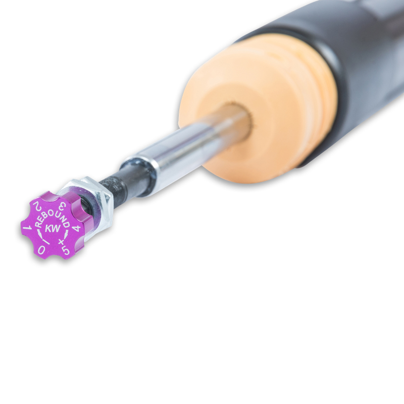 KW V2 INOX-LINE coilovers are the perfect solution for drivers who want more than just outstanding looks and adjustable ride height. In addition to stainless steel coilover struts, and corrosion-resistant components built for long term durability, KW V2 coilovers utilize TVR-A (Twin Valve Rebound – Adjustable) technology that allow Adjustment of the rebound damping characteristics with 16 clicks so you can fine tune the ride comfort or performance to your satisfaction. As with all KW coilovers our engineers develop vehicle specific damper settings that undergo comprehensive testing on the Nurburgring Nordschleife and in our KW 7-post Driving Dynamic Test Center. With a KW coilover kit the driving experience is more dynamic and direct. With the rebound adjustability you have a more direct influence on the handling or comfort of the car. With 16 precise clicks you can adjust the KW dampers (more firm or more comfortable) without affecting the compression damping fine-tuned by our engineers. The two-stage, patented TVR-A (Twin Valve Rebound – Adjustable) technology enables a small volume of oil flow through an adjustable, conically shaped, low-speed bypass during low damper speeds, while at high damper speeds, the main rebound stage valve opens allowing a larger volume of oil to flow. This provides a big improvement in terms of ride comfort without influencing the high-speed range. There are 16 precise clicks available for individual settings, so you can choose between more comfort or more body control. With KW V2 coilovers you can achieve maximum lowering within an approved lowering range that ensures a proper functioning suspension and adequate travel after your car is lowered. Even after years of use you can easily adjust the ride height thanks to the dirt resistant trapezoid thread and composite adjustment collar.