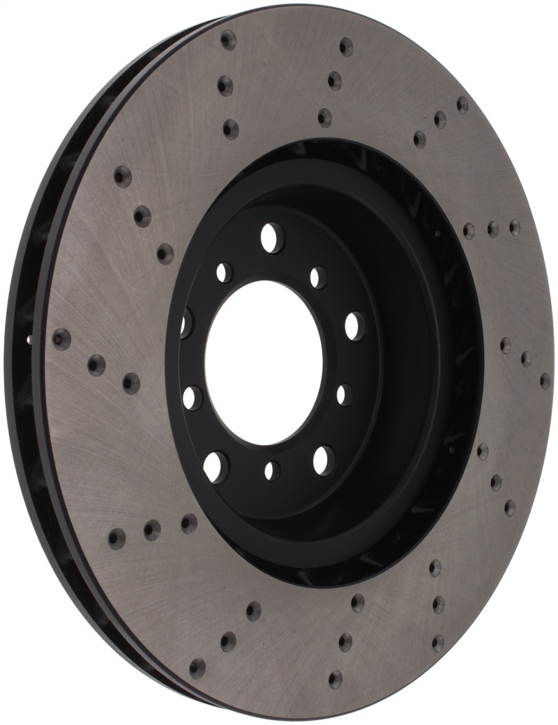 StopTech Drilled Sport Rotors are 1-piece direct replacement brake discs for factory brake systems and stock calipers that look great behind your wheels a** and offer significantly improved braking performance. The unique cross-drilling aids with heat and brake dust dispersal; prevents glazing of the pads; adds bite and improves wet and dry braking performance. Built to last; the black e-coating provides protection from corrosion and the high carbon metallurgy (in most applications) offers quieter operation; better crack resistance and increased performance.