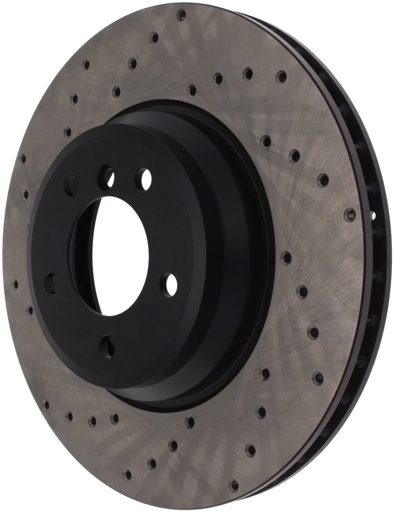 StopTech Drilled Sport Rotors are 1-piece direct replacement brake discs for factory brake systems and stock calipers that look great behind your wheels a** and offer significantly improved braking performance. The unique cross-drilling aids with heat and brake dust dispersal; prevents glazing of the pads; adds bite and improves wet and dry braking performance. Built to last; the black e-coating provides protection from corrosion and the high carbon metallurgy (in most applications) offers quieter operation; better crack resistance and increased performance.