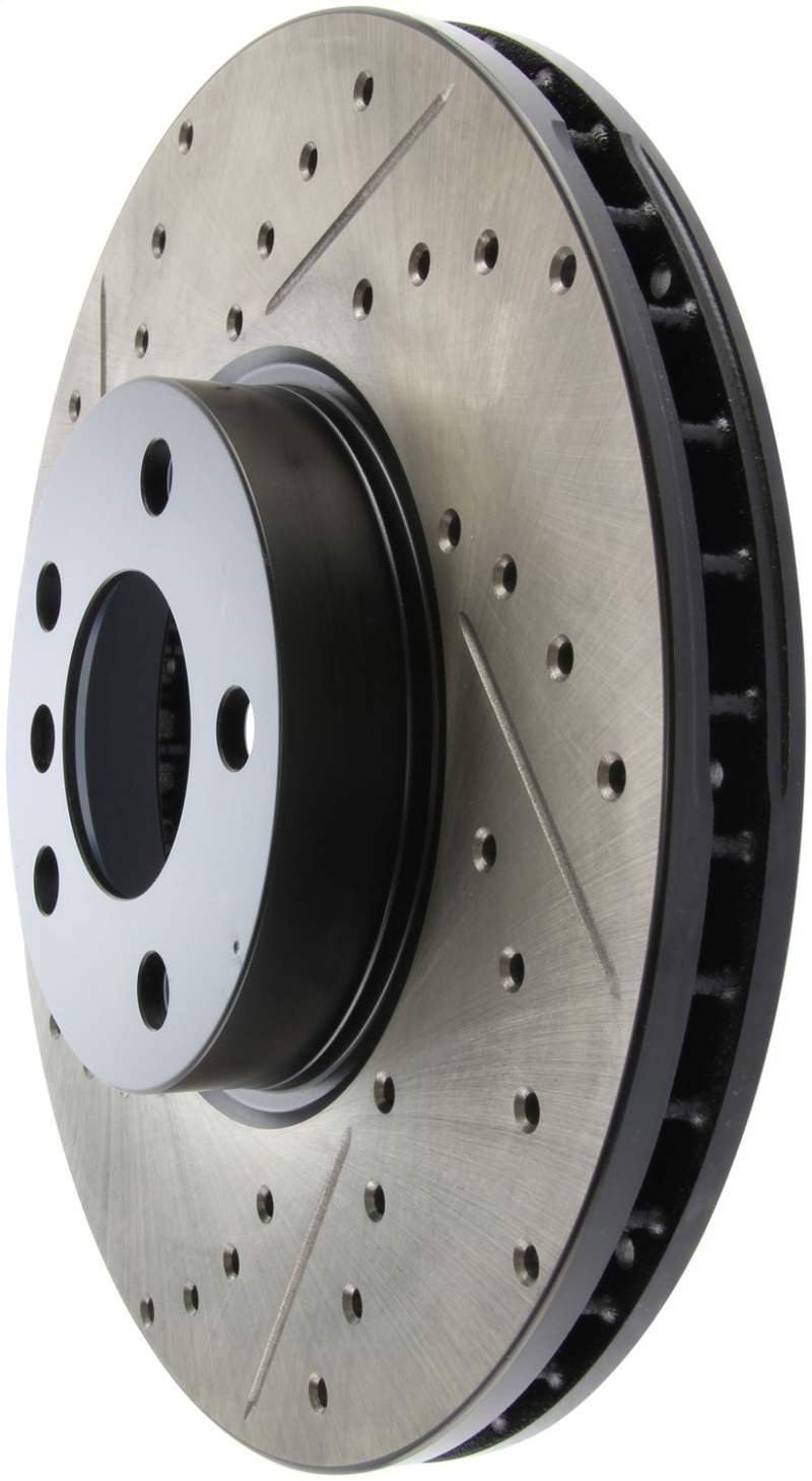 StopTech Drilled and Slotted Sport Rotors are 1-piece direct replacement brake discs for factory brake systems and stock calipers that look great behind your wheels a** and offer significantly improved braking performance. The unique cross-drilling and slotting aids with heat and brake dust dispersal, prevents glazing of the pads, adds bite and improves wet and dry braking performance. Built to last, the black e-coating provides protection from corrosion and the high carbon metallurgy (in most applications) offers quieter operation, better crack resistance and increased performance.