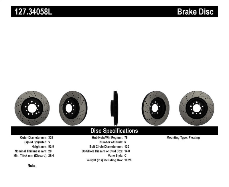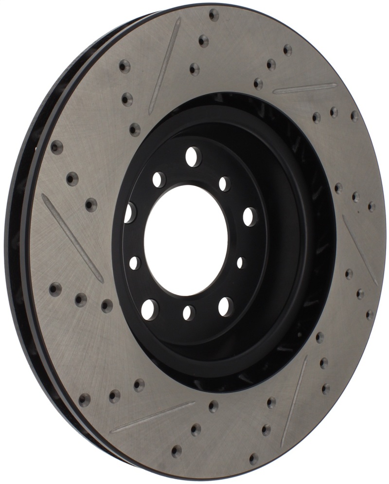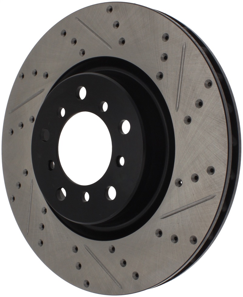 StopTech Drilled and Slotted Sport Rotors are 1-piece direct replacement brake discs for factory brake systems and stock calipers that look great behind your wheels a** and offer significantly improved braking performance. The unique cross-drilling and slotting aids with heat and brake dust dispersal; prevents glazing of the pads; adds bite and improves wet and dry braking performance. Built to last; the black e-coating provides protection from corrosion and the high carbon metallurgy (in most applications) offers quieter operation; better crack resistance and increased performance.