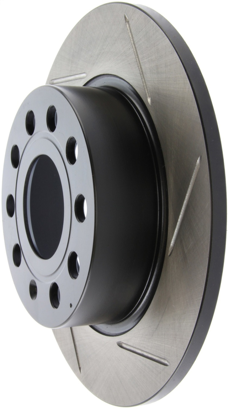 StopTech Slotted Sport Rotors are 1-piece direct replacement brake discs for factory brake systems and stock calipers that look great behind your wheels a** and offer significantly improved braking performance. The unique slotting aids with heat and brake dust dispersal; prevents glazing of the pads; adds bite and improves wet and dry braking performance. Built to last; the black e-coating provides protection from corrosion and the high carbon metallurgy (in most applications) offers quieter operation; better crack resistance and increased performance.