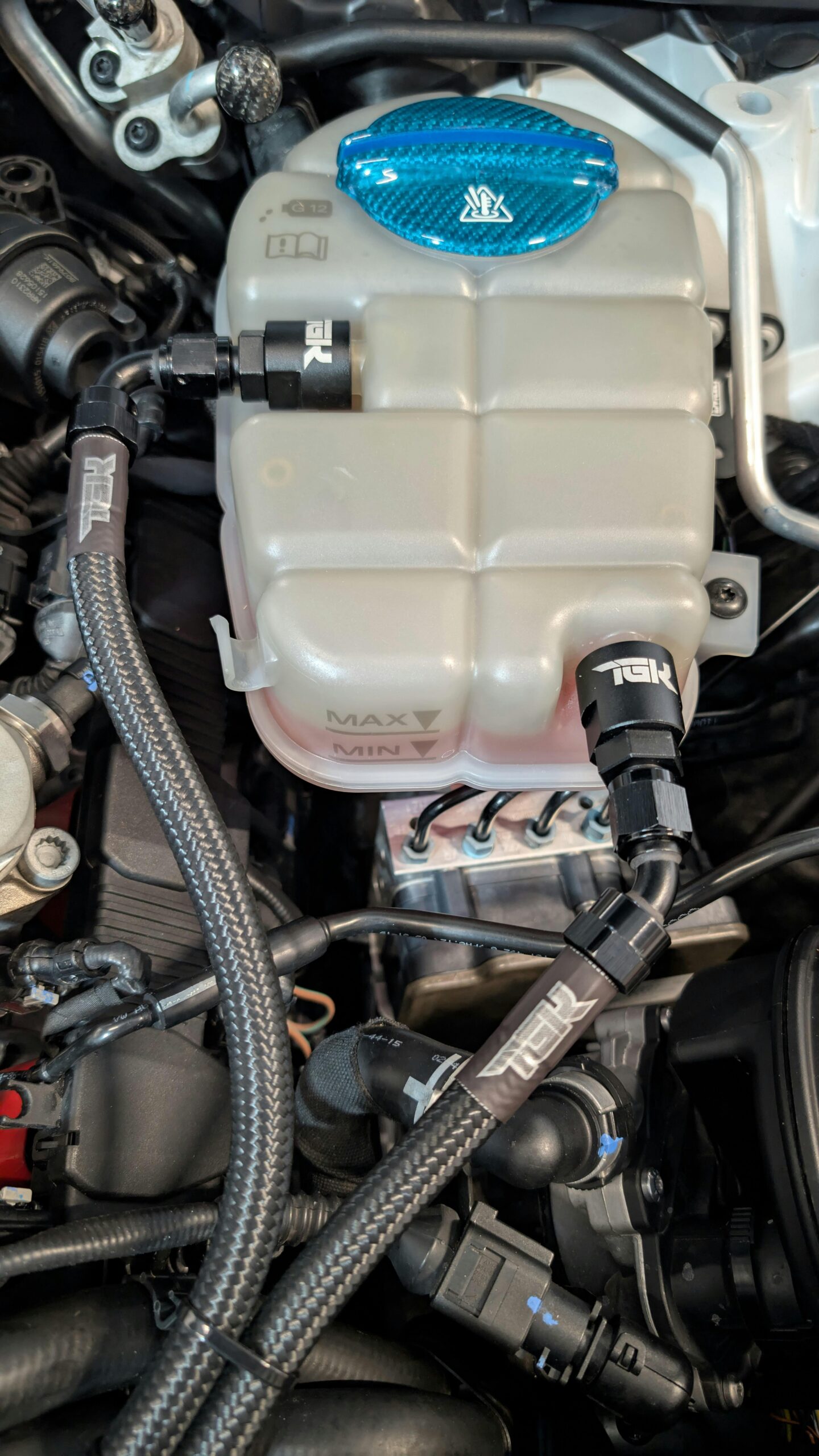 TGK Motorsport Audi S6 / S7 V8 4.0T C7 / C7.5 Coolant Tank AN Line Kit upgrades the factory coolant tank plumbing with durable AN fittings and high-quality braided lines for improved reliability and engine bay aesthetics. Designed specifically for Audi C7 and C7.5 S6 and S7 4.0T models, this kit replaces the restrictive OEM hoses to provide a cleaner installation and more robust coolant system connections, making it ideal for both performance builds and maintenance upgrades.