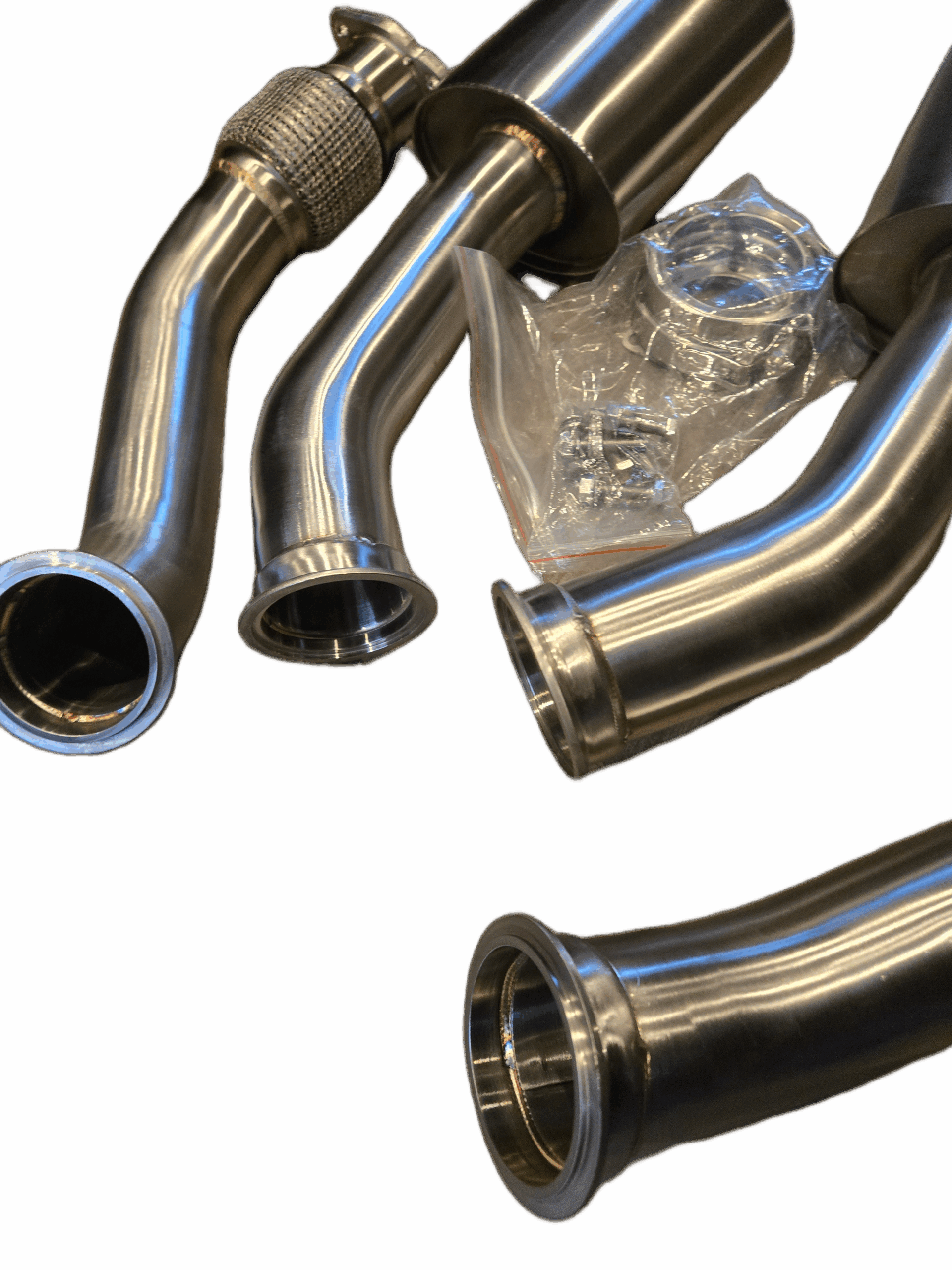 Upgrade your weak OEM downpipes with the Untd. Performance Lower Resonated Downpipes with V-Band for enhanced airflow, improved reliability, refined yet aggressive sound, and faster turbo response.